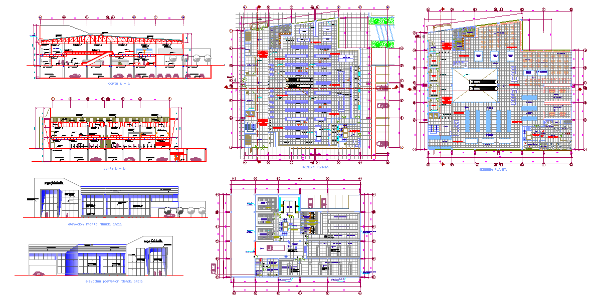 The architecture layout plan of ground floor plan, first floor plan, second floor plan and third floor plan with furniture detailing, section plan and elevation design of Shopping Center plan.Modern Shopping Centre Complex Design File, Modern Shopping Centre Complex Detail file.