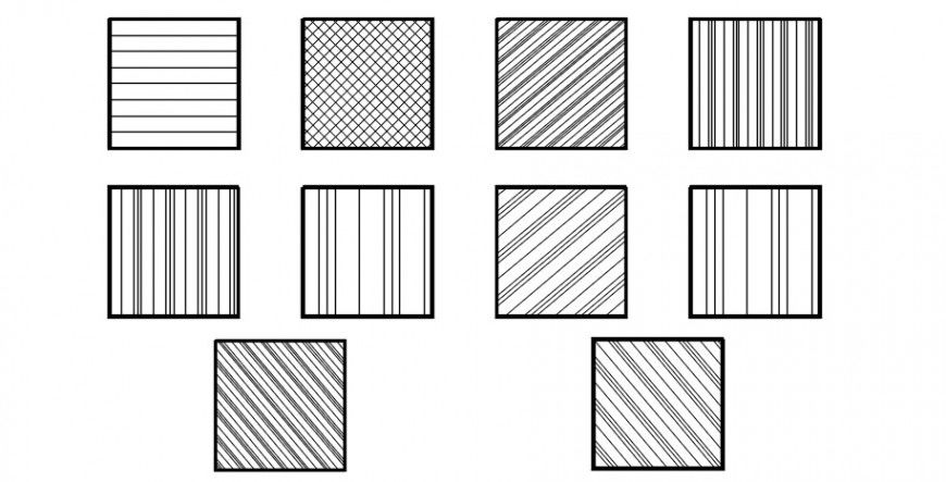 Boxes of hatches designs.here there is model detail of different types of hatches detail with concrete filing, lines, squares , Cris and cross, horizontal lines, vertical lines, staright and other types.