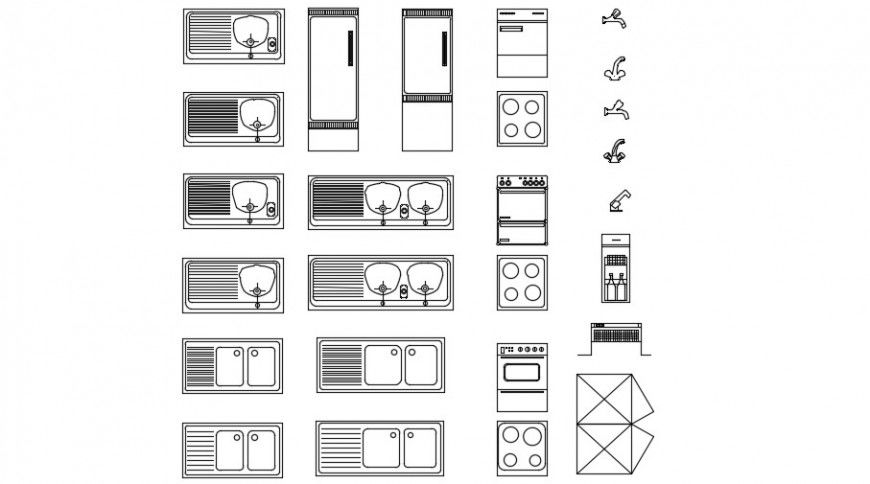 2d cad drawing of kitchen burner stove with different design and size, sink, faucet download in free cad blocks and use for kitchen cad presentation.