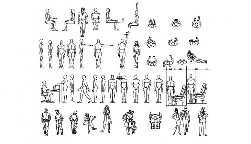 2d cad drawing of people and robot blocks in different angle seating and standing, side view and top view of blocks, download in free cad file and get more detailing about people blocks dwg file.