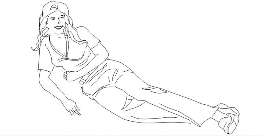 Lady pose 2d cad block. here there is 2d block detail model of a lady lying on the floor with happy face detailing in auto cad format