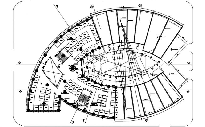 Sectional view plan of a hotel . here there is top view plan detail of a hotel with section lines and departments details with ducting and spacing view in auto cad format