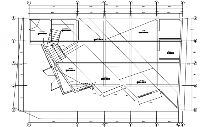 Cafeteria top view architecture plan.here there is top view cafe plan with staircase plan and sectional detail view with name of departments in autocad format