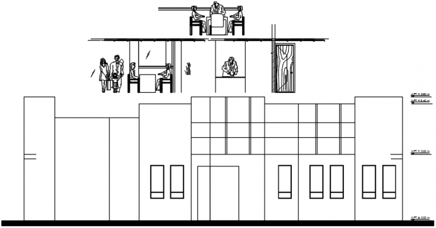Cafeteria sectional elevation details dwg file. here there is front sectional detail of cafe showing seating arrangement with human figure detailing in 2d format