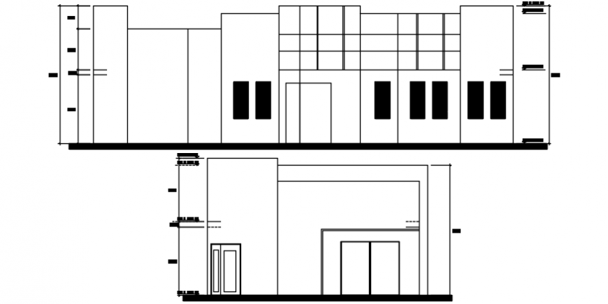 Sectional elevations of cafe building. here this auto cad file contains sectional elevation details of side and front building design with big exterior view of building in 2d format