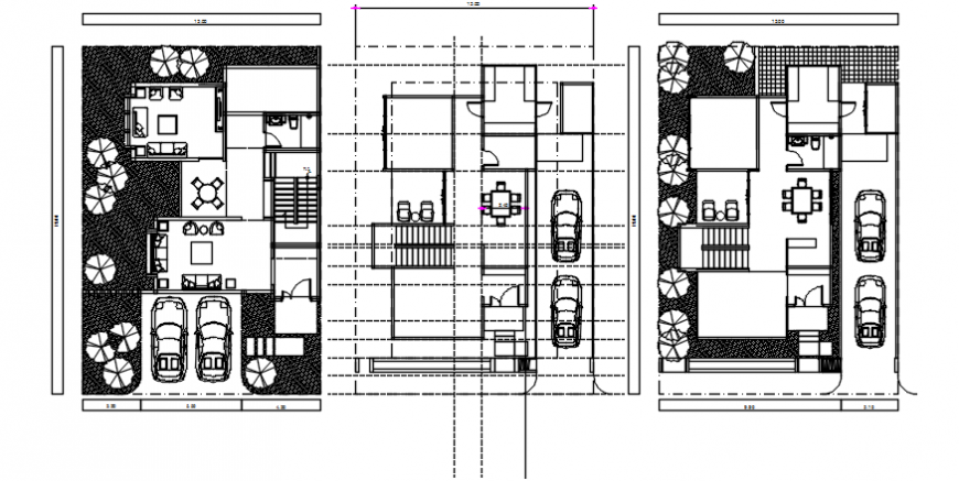interior project dwg file, here there is top view layout plan of a house,containing furniture details,sofa, dining, plantation and car parking details view in 2d format