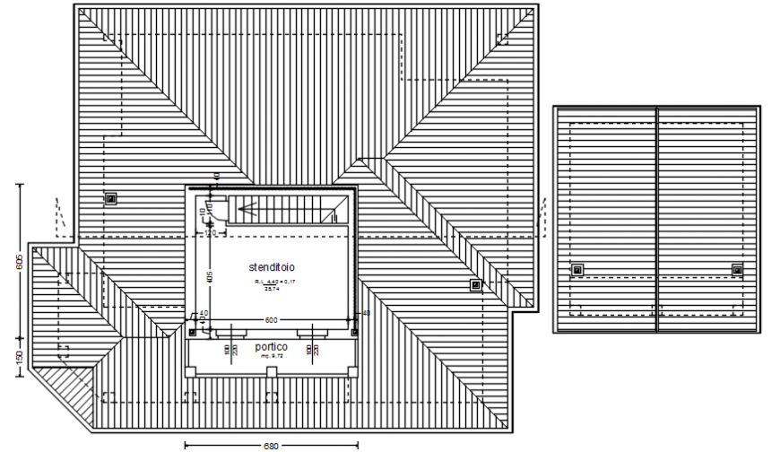 Terrace roofing detail of the villa model. here there is top view roof structure file model details with text detailing and complete top view plan details with section