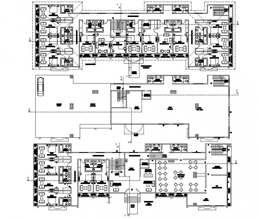 the architecture layout plan has been designing in autocad software, a Drawing showing layout plan includes bedrooms 16'4.75" X 11'9.75" FT, attached bathrooms, wide passage, reception area, waiting area, lift and staircase, restaurant, kitchen, bar, along with all furniture detailing, download in free autocad file and get more detailing about hotel project autocad file.