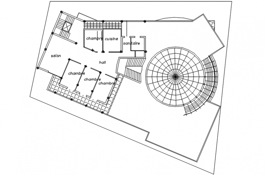 Chamber top view sectional plan showing circular glass look detailing file with different cabins detailing in 2d format