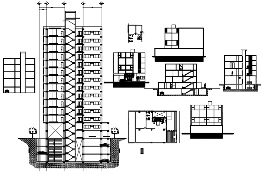 Sections of high rise building. This autocad file contains Sectional elevation of a high rise building concept detail with building exterior view and human figure detailing design file and other details in auto cad format