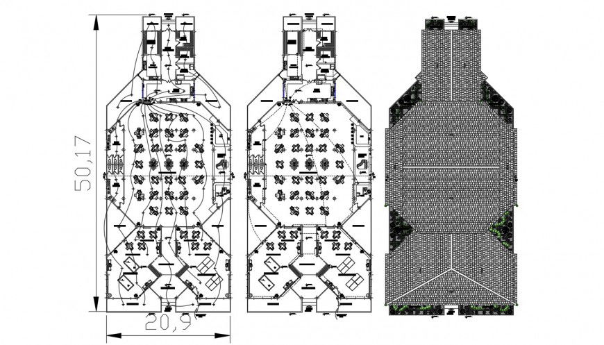 Restaurant local cuisine autocad software detaield with long lobby enterance with office rooom aside and other view with reception area and dining area. Electrical connection been shown from top view with connected wire towards one elecatrical guage area.