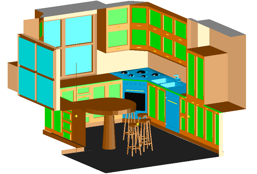 This kitchen 3D view Draw in autocad format. Modern interior design of kitchen including the cabinet design, wall and all side elevation plan for the perfect kitchen interior design.