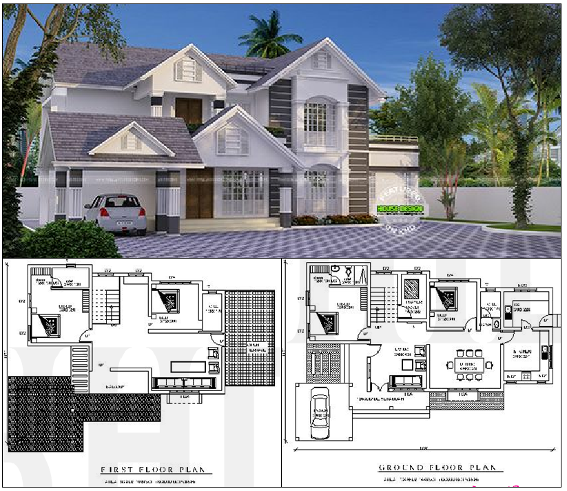 The Architectural layout plan of ground floor plan, first floor plan and second floor plan include kitchen, parking space, drawing room, family room and bedrooms also detailing about front elevation plan and side elevation plan of modern bungalow design.Modern Bungalows Design, Modern Bungalows Detail.