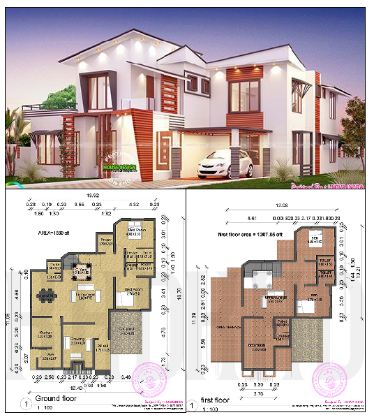 Modern Bungalow plan autocad file. The architecture layout plan of Ground floor plan: 2 bedroom, guest room, family room, kitchen, dining room, wide parking area, garden. and First floor plan: 3 bedroom, seating room, reception area and out side balcony its a modern bungalows.