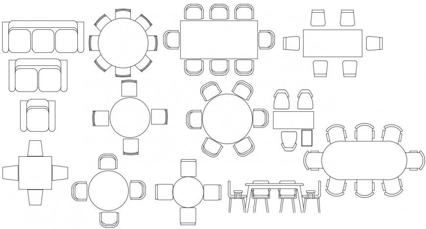 Dining tables 2d elevation concept file. Dining table top view dwg file, here there is top view of table with chairs and various seaters and types of tables and chairs with sectional detail of dining table in auto cad format