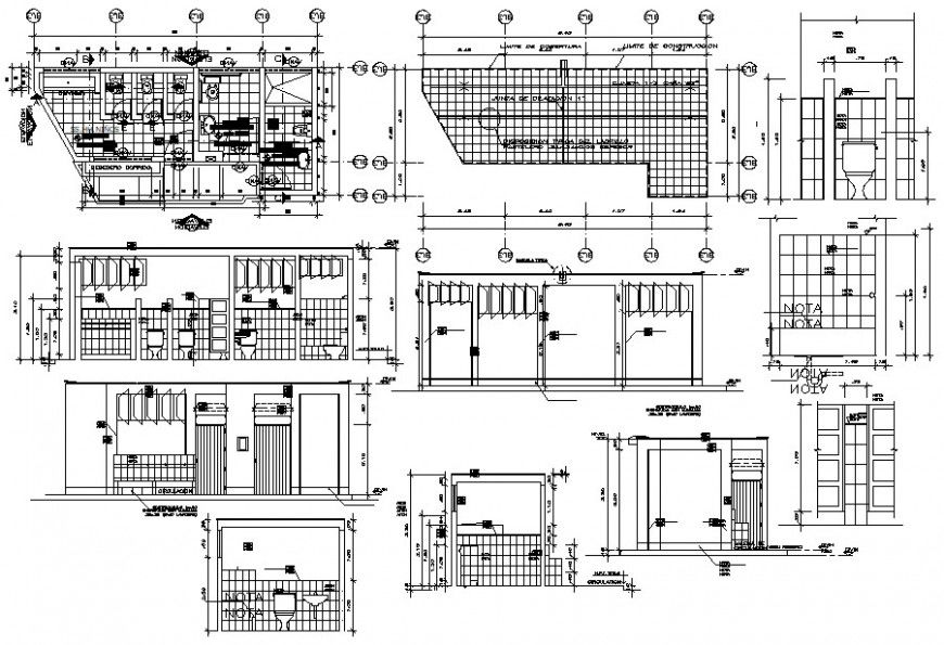2d cad drawing of bathroom layout plan, section plan, structure plan, plumbing installation detail, sanitaryware detailing, along with all side section plan and elevation design of school bathroom project cad file.