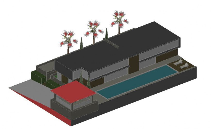 3d model of swimming pool center cad file includes building for changing dress and shower, out side swimming pool, and tree blocks for improvthe cad presentation.