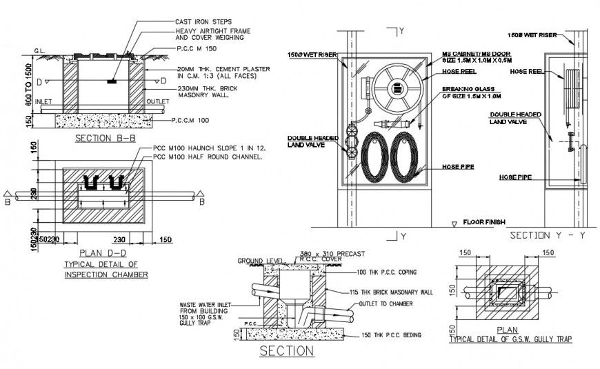 Detail of inspection chamber autocad file detailed with basic struture and haunch slope and floor finish and other castiron steps and typical detail of gully trap and section elevation with strtuee with slope round channel