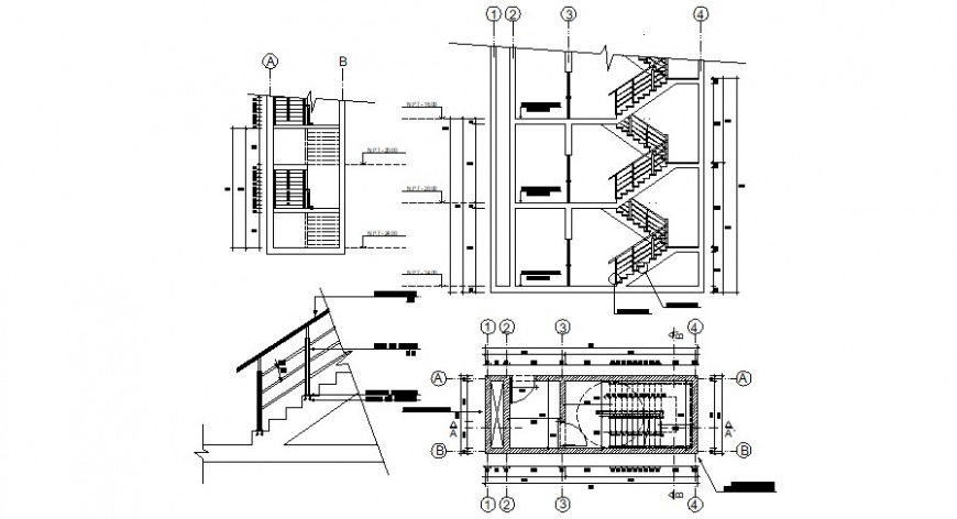 2d cad drawing of section plan, top view, slab detail, longitudinal spanning of stair slab is also possible with other configurations including single flight, open-well helicoidal and free-standing staircases, download in free autocad file and use for cad presentation.