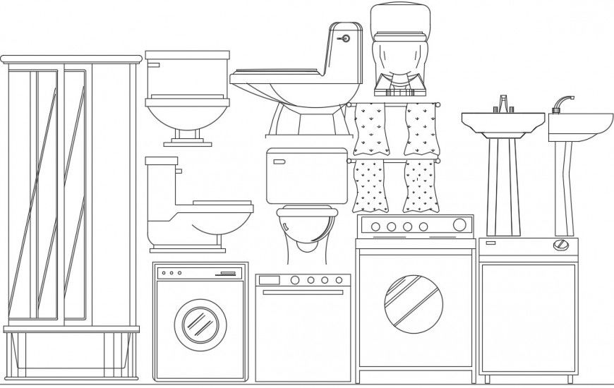 Household utility cad block detail file. here there is front 2d model of bathroom wc detailing, wash baisn details and washing machine design sectional model file