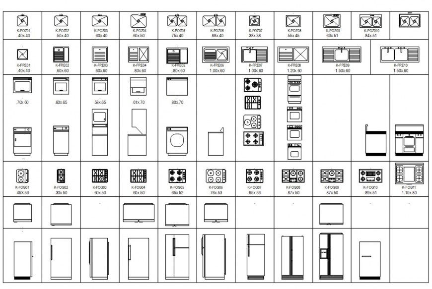 2d cad drawing of Kitchen blocks includes a sink, gas burner stove, washing machine, storage movable table, refrigerator along with different model and size description detail in cad file, download in free autocad file and use for modular kitchen cad prsesentation.