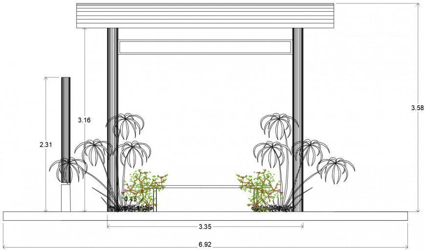 Bus shelter sectional elevation file. here there is 2d elevation of bus shelter designing with shed roof and plantation model file in auto cad format