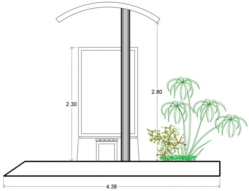 Side bus stand sectional detail file. here there is 2d detailing of front and side sectional detailing of bus stand pole detailing with plants and garden surrounding detail