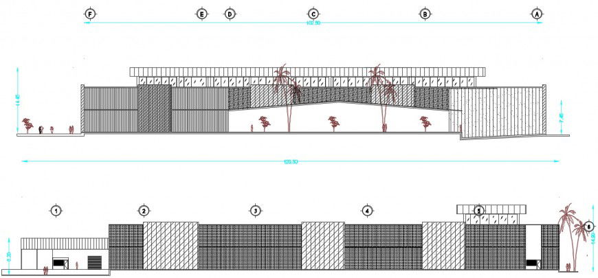 Store Sectional detail model file.here there is 2d elevation of a big building design,landscaping detail , human figure detailing with dimensions detailing file in auto cad format
