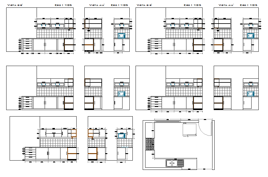 Kitchen Furniture Design Download file. Modern design of kitchen detail about cupboard, cabinet door, solid wooden panel, gas & fridge storage, dining table also detailing of plan in all side of modular kitchen design.