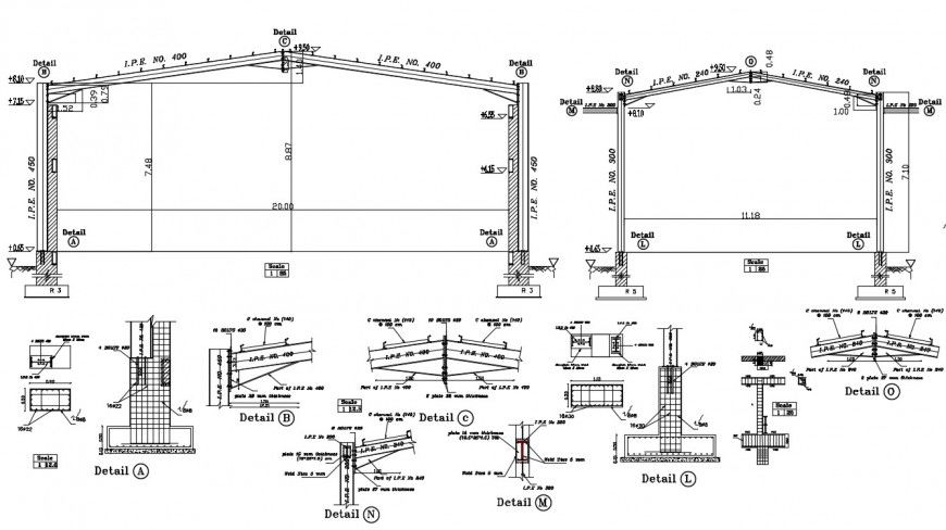 Hall steel elevation autocad software detailed with basic connection detail with all strture base and seen with connected parts and other elevation with long wall strture and hatch lines given for drawing.