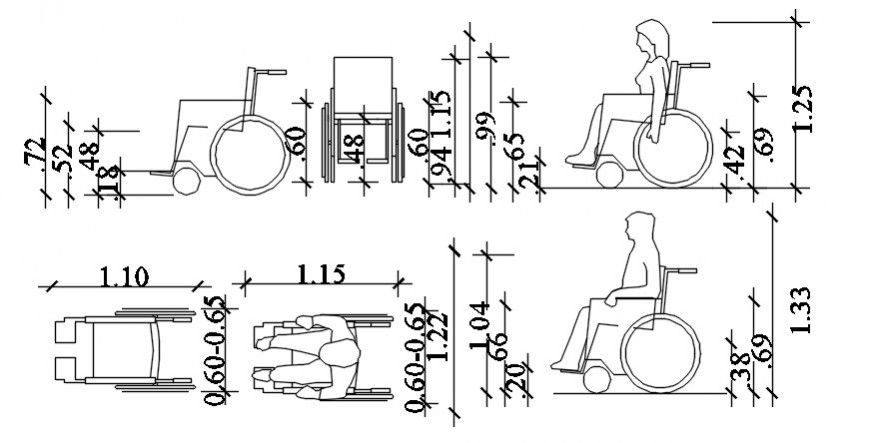 2d cad drawing of hospital chair wheelchair blocks dwg file include top view, section plan and elevation design of cad file, download free cad file and use foir cad presentation.