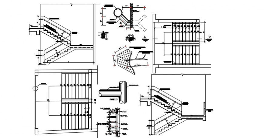 2d cad drawings details of staircase detail, elevation detailing with hatch area blocks dwg file that includes line drawings of staircase construction blocks and download free cad file and use for cad presentation.