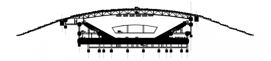 Autocad drawing of basketball stadium section showing all the required details including foundation and roofing detail with dimensions, material indication of structure with respective material hatch, surrounding areas, eye vision angle of every individual seat to the court, etc.