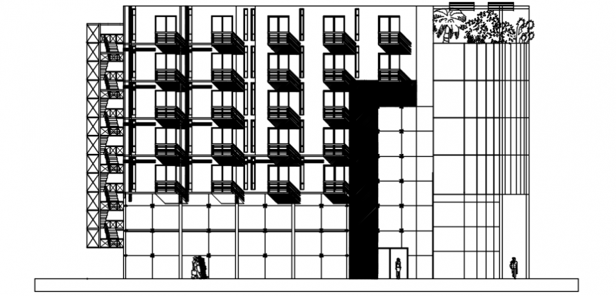Autocad drawing of hotel facade elevation with all the required details including balcony projections, surrounding landscape areas with plantations, service staircase detail, etc.