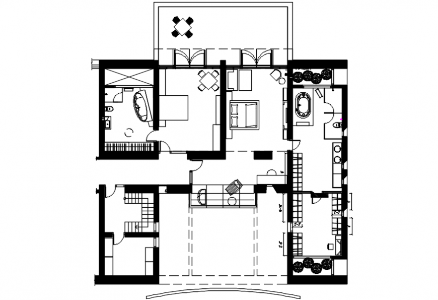interior project dwg file, here there is top view layout plan of a house,containing furniture details,sofa, dining, plantation etc
