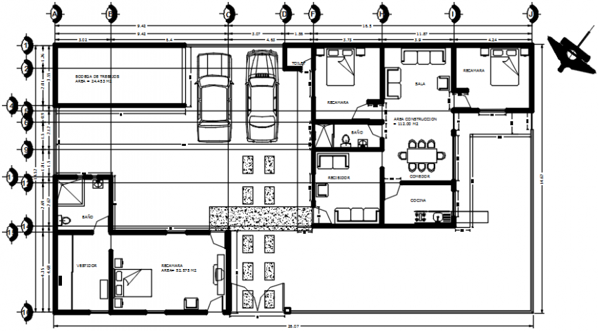interior project dwg file, here there is top view layout plan of a house,containing furniture details,sofa, dining, plantation etc