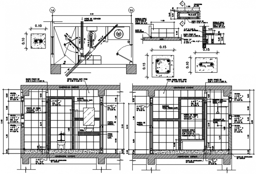 Bathroom elevation design dwg file, here there is wc detailing with dimensions, plumbing and piping details and bathroom vanity unit and mirror with ventilation and tiles detail in auto cad format