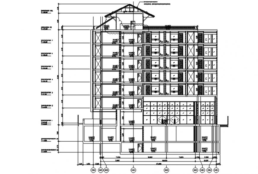 Section of an hotel in autocad showing all the required details like wall thickness with door-window openings and respective material description by hatching, vertical dimensions with floor to floor hieghts, room specification with furniture layout and ciruclation space, roofing details, etc.
