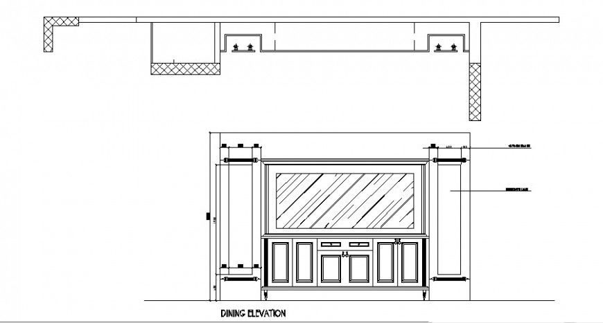 Find here 2d front elevation design of dining unit that showing table under cupboard and furniture detail in autocad file.