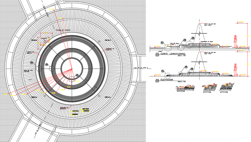 find here 2d elevation design of fountain with the Water level height +9.87, also have pieta and floor meet, finished in pepelma, and top view of fountain drawing autocad format.