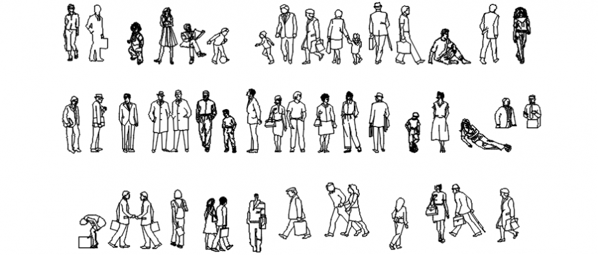 Autocad drawing of human figures showing different humans in elevation doing different activities with all details.