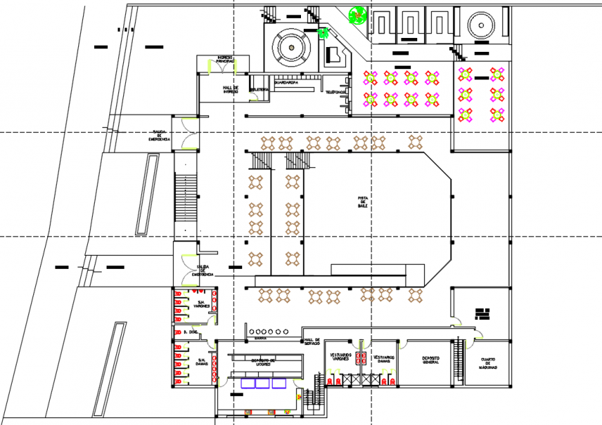 2d drawing of restaurant layout plan showing, seating arrangement, furniture detail, kitchen, ladies and gents toilet, bar, office hall stage and much more detail of the restaurant project.