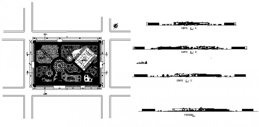 2d cad drawing of public garden design includes concrete wall, Polished Concrete Sidewalk, Lawn with irrigation system, and elevation design along with free download feature.