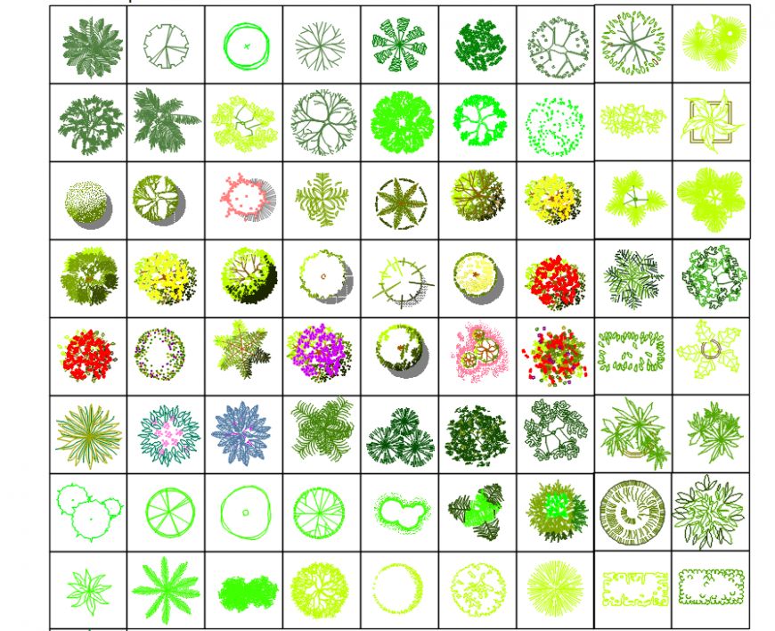 2d top view of garden tree and plant blocks which is used in the garden and landscaping design to improving the presentation in autocad format, download free feature of blocks cad file