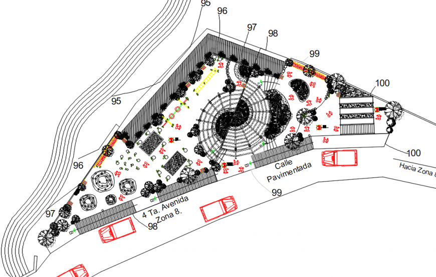 find here the top view of public garden drawing along with fountain, garden, child play tools, and many more details in this cad file get free download feature of autocad software file.