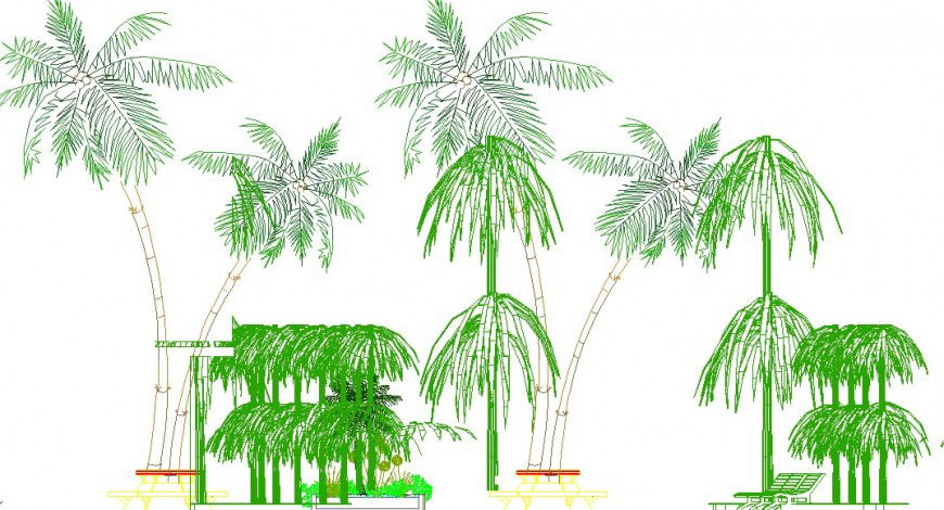 2d elevation design of cad blocks includes coconut tree and a banana tree in autocad format, which is used in landscaping design in autocad software file download in a free feature.