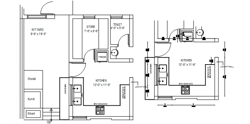 find here layout plan of Modular kitchen design includes store room, kundi, platform, burner stove along with all dimension detail in autocad format download in a free feature.