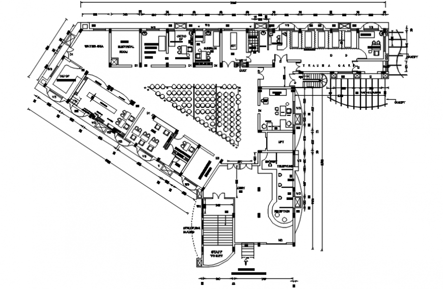 Hospital top view layout plan details , here there is top view layout plan of a hospital with various departments and text detailing in auto cad format