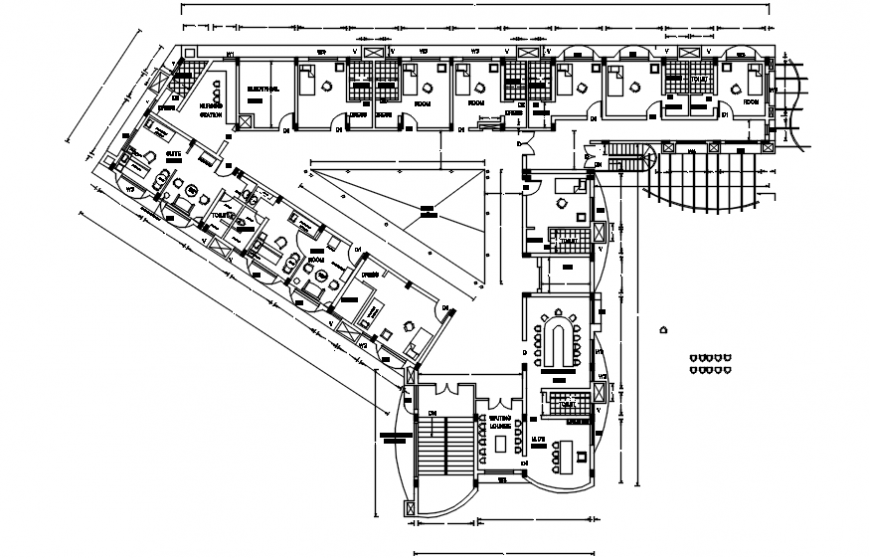 Hospital top view layout plan details , here there is top view layout plan of a hospital with various departments and text detailing and hospital rooms and furniture detail in auto cad format