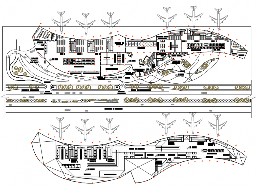 the architecture layout plan with all furniture detail and plane parking area, boarding room along with much more detailing in cad file of the airport project
